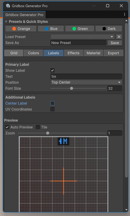 - Tabbed interface: Grid, Colors, Labels, Effects, Material, Export